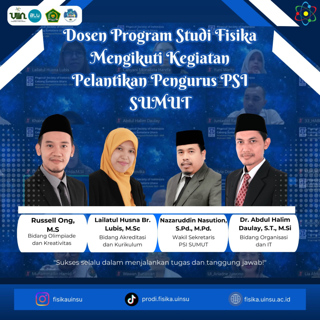 Program Studi Fisika UIN Sumatera Utara menyampaikan ucapan selamat dan apresiasi kepada para dosen yang telah dilantik dan diberikan amanah sebagai pengurus PSI Sumatera Utara. Semoga tanggung jawab yang diemban dapat dijalankan dengan penuh integritas, profesionalisme, dan semangat pengabdian, sehingga mampu membawa kontribusi nyata bagi pengembangan ilmu fisika, penguatan organisasi profesi, serta kemajuan pendidikan tinggi di Indonesia.